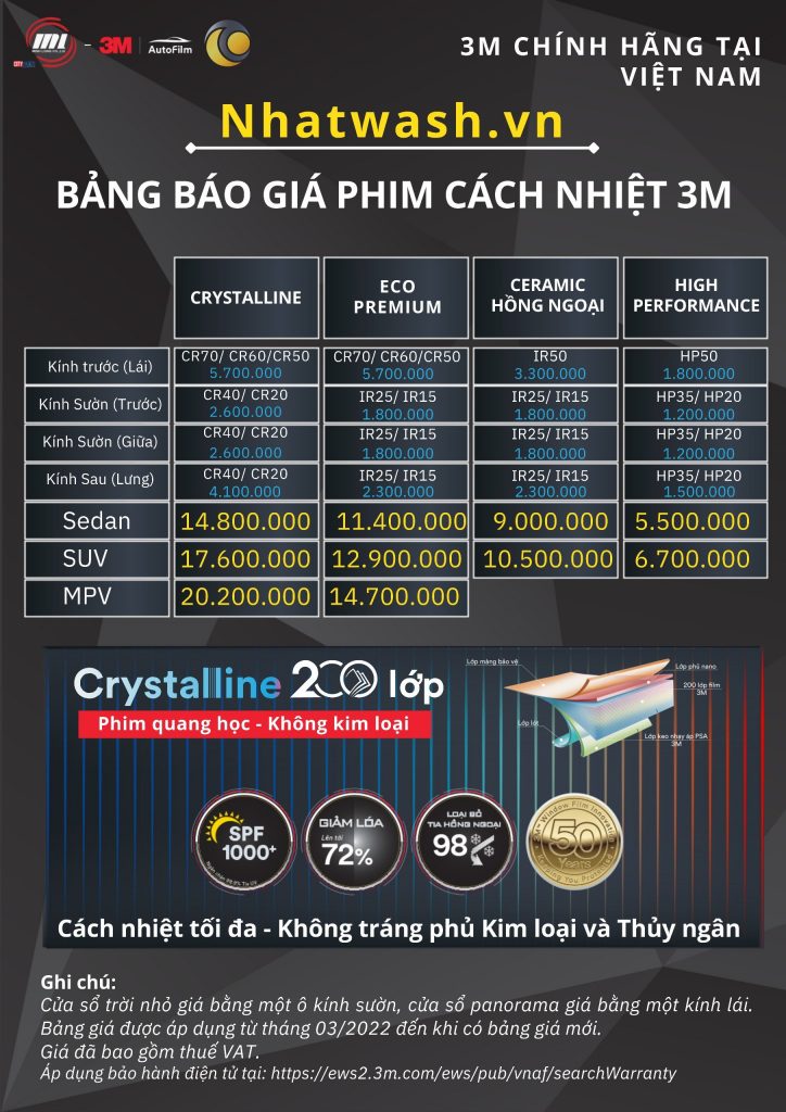 Tham khảo bảng giá dán phim cách nhiệt 3M tại Nhatwash sau đây: